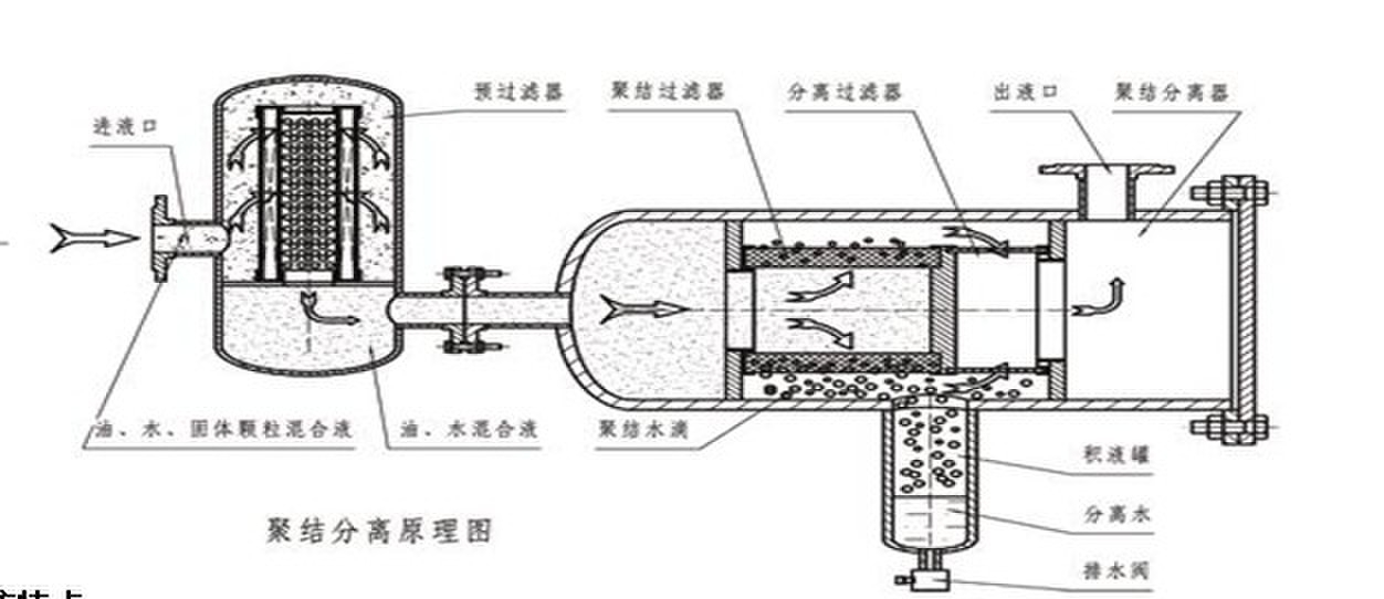 分離系統(tǒng)的分離濾芯由特殊的疏水材料制成,油液通過濾芯時,水珠被擋在濾芯的外表面,相互聚結(jié)直至因重力作用,沉降至儲水罐內(nèi)。